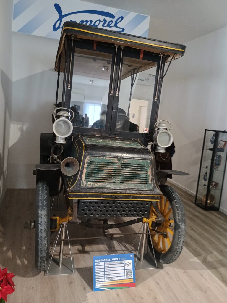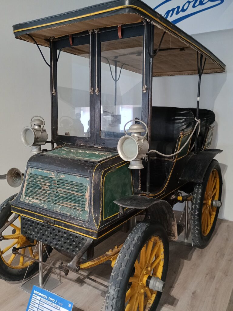 Il reperto di maggior valore storico della collezione è senza dubbio la Vermorel Tipo 2 del 1898. Questo veicolo detiene il primato di essere la prima automobile documentata arrivata in Sardegna, segnando ufficialmente l’inizio dell’era dei motori nell’isola. La Vermorel si presenta come una “carrozza motorizzata”, un termine che evidenzia la transizione estetica ancora incompleta dai veicoli a trazione animale. La sua meccanica semplice ma robusta doveva confrontarsi con una rete stradale sarda che, alla fine dell’Ottocento, era ancora rudimentale e composta prevalentemente da sentieri e strade bianche pensate per i carri a buoi.