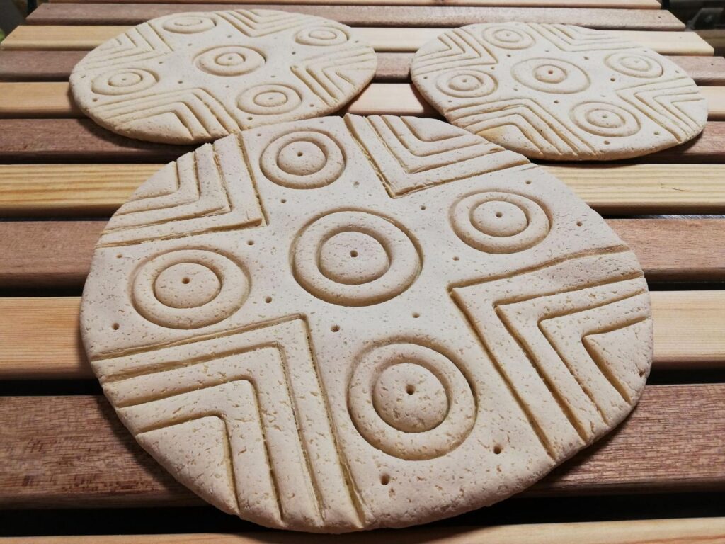 Le prime pintaderas rinvenute in Sardegna risalgono alla cultura di Ozieri (Neolitico Recente, 3200-2800 a.C.). Questo le colloca in un orizzonte culturale pre-nuragico, dimostrando che l’esigenza di decorare e identificare attraverso un sigillo è ancestrale. Rinvenute spesso in contesti sacri (tombe, templi), fanno pensare che il loro uso non fosse solo profano. Alcune teorie le collegano a riti propiziatori legati alla fertilità della terra, di cui il pane era il frutto supremo.