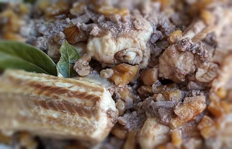 - La Salsa Nera (Su Schittu): Il cuore segreto del piatto. È un’emulsione rustica e potente fatta di: