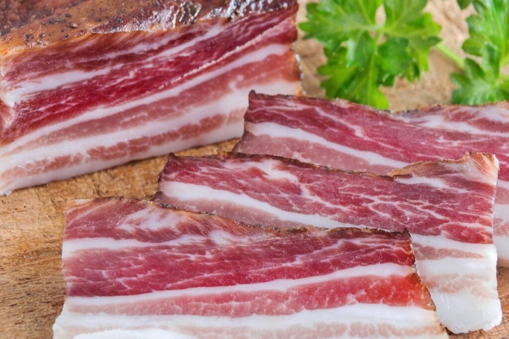 Stagionata e spesso arrotolata con le sue spezie, è un altro pilastro. Può essere anche affumicata (pancetta affumigada).