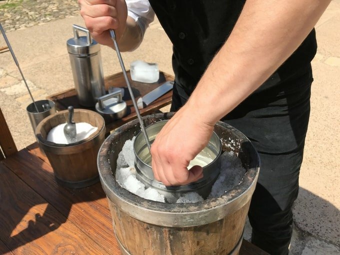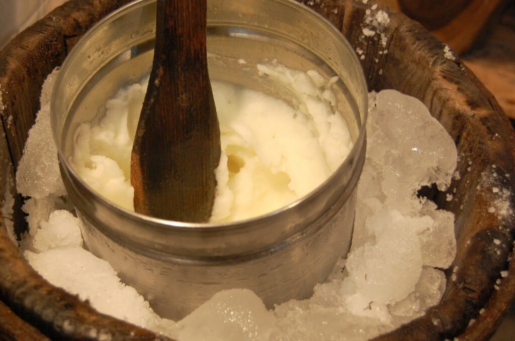 A differenza dei gelati moderni, che utilizzano refrigeratori elettrici, sa carapigna si ottiene ancora oggi con una sorbettiera manuale, utilizzando esclusivamente il freddo generato da una miscela di ghiaccio e sale . E attenzione: il ghiaccio non è un ingrediente, ma un semplice agente refrigerante . È questa la sua caratteristica più autentica.