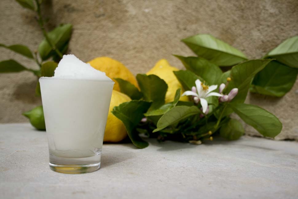 - Su bagnu: la miscela base, preparata con acqua, zucchero e succo di limone fresco. La qualità del limone, e in particolare della sua scorza, è fondamentale per il successo del sorbetto .