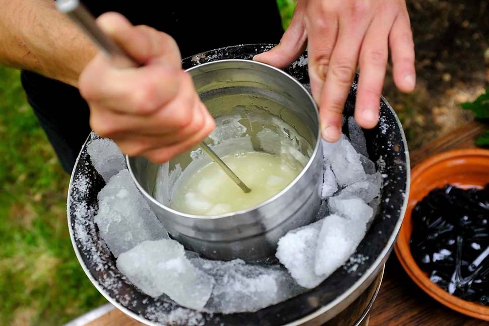 - Si inizia a girare vorticosamente sa carapignera, azionandola per circa 40 minuti. Questo movimento continuo favorisce lo scambio termico e impedisce la formazione di cristalli di ghiaccio troppo grandi .