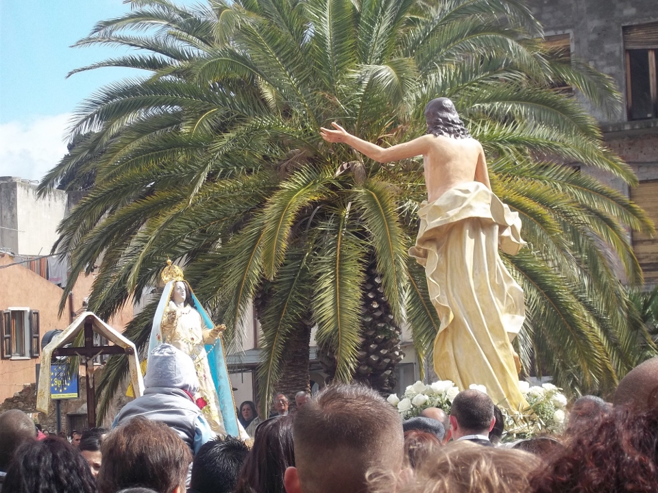 È un rito di una teatralità semplice e potente. Due processioni partono da chiese opposte del paese. Una porta il simulacro di Cristo Risorto, splendente e vittorioso. L’altra porta la statua della Madonna Addolorata, ancora velata di nero per il lutto .